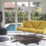 The light steel structure gives the impression that the couch is floating while the velvet fabric intensifies its presence in the space. The metal structure and upholstered seating area are unified through their shared geometric language.