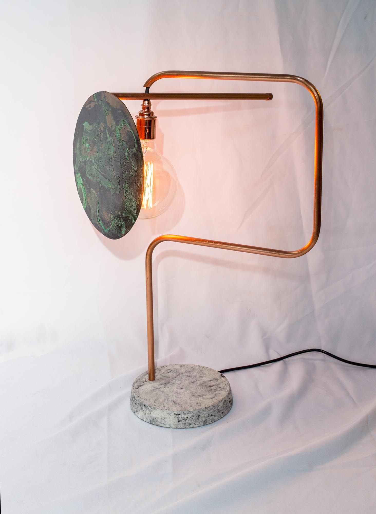 Revolving shade around the bulb. – Concrete base and copper lamp